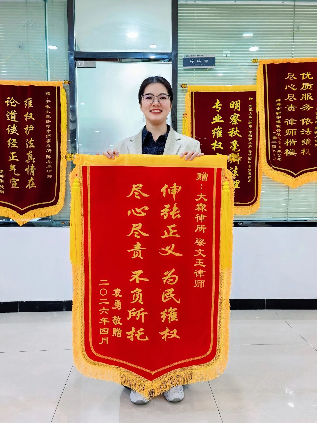 从剑拔弩张到握手言和,一场劳动争议在梁律师的专业斡旋下圆满化解。袁某事后专程送来锦旗,上书:“伸张正义为民维权,尽心尽责不负所托”。他说:“梁律师不仅帮我拿到了赔偿,更让我少走了弯路。”
